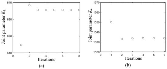 The principle of the Gauss–Newton iteration method states that its algorithm stability is closely related to the initial value of the iteration [35]. Therefore, it can be considered to detect the feasibility of the algorithm by selecting different initial iteration values. The iterative process is shown in Figure 6, Figure 7 and Figure 8. When the error between the initial value and the true value is set to 20%, after six iterations, the parameters tend to converge and are relatively close to the true value. The error is within 2%. And the durations under wet clay and sandy loam conditions were 0.37 and 0.73 s, respectively. The iteration results are shown in Table 3.