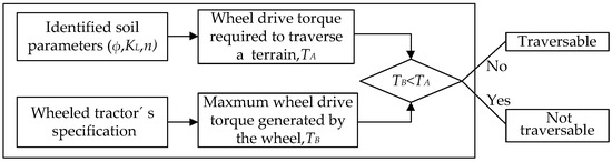 When the driving wheel torque is less than the torque required to cross the terrain, the driving wheels will slip, preventing the tractor from moving. To address this scenario, a traversability criterion for wheeled tractors on unknown terrains can be established, as depicted in Figure 12.
