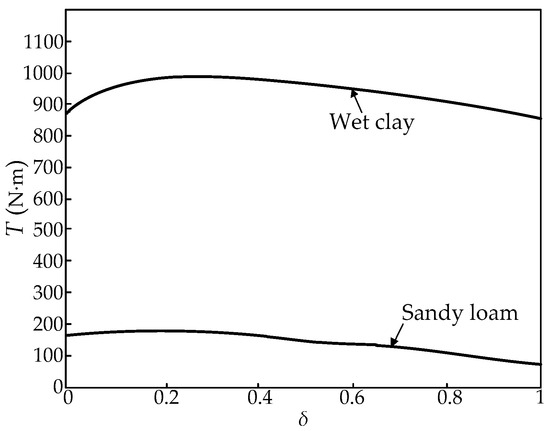 With the application of Equation (18), the identified soil parameters can be utilized to forecast the wheel drive torque required for wheeled tractors to traverse various terrains. Figure 13 depicts the wheel drive torques required for two distinct terrains. If the wheel drive torque is 500 N·m, the tractor will be capable of traversing sandy loam, which necessitates wheel drive torques of less than 200 N·m, but it will not be able to traverse wet clay, whose wheel drive torque required for passage through is approximately 1000 N·m.