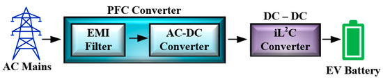 Due to the contamination caused by toxic gases, carbon emissions, and unpredictable weather patterns, conventional internal combustion engines are approaching their maximum capabilities. There is a global initiative to implement environmentally friendly transportation in order to mitigate the effects of climate change. Electric vehicles (EVs) are increasingly becoming popular due to their environmentally advantageous nature, aiming to replace internal combustion engines (ICEs) and reduce carbon dioxide emissions [1,2,3]. By transitioning to electric vehicles, such as battery electric vehicles (BEVs), fuel cell electric vehicles (FCEVs), hybrid electric vehicles (HEVs), ultra-capacitor electric vehicles (UCEVs), solar-charged electric vehicles (SCEVs), and plug-in hybrid electric vehicles (PHEVs), we can significantly reduce pollutants [4,5]. The goal of achieving a carbon-free society by 2030 in Europe and 2050 in India is ambitious but achievable with the swift adoption of EVs and the development of robust charging infrastructure. This transition not only contributes to environmental preservation but also promotes technological advancement and energy independence. The increasing demand for electric vehicles necessitates the development of a strong and efficient charging infrastructure. The information in [6,7] covers power electronics for several applications such as solar energy, fuel cells, renewable energy, and electric cars. It also discusses optimization approaches for various charging topologies. Figure 1 illustrates a standard block diagram of a charging infrastructure.