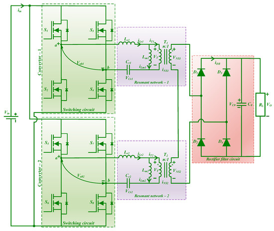 In the present scenario, the EV industry is looking for a scalable design that can operate over wide operating ranges and easily adjust to different power requirements [8]. The need for scalability is increased because battery charging technology has improved over a wide range from 48 V to 800 V and even larger in some cases. The scalable designs are helpful with their quick adaptability of operation to the desired voltage range [9]. Resonant converters are more popular for their merit of operation over wide operating ranges; hence, this paper deals with an advanced resonant converter named the iL2C converter, which is an extension of the L2C converter [10,11].