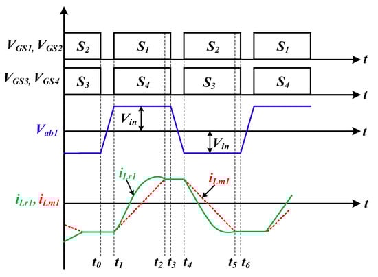 Stage 1: All secondary-side diodes are deactivated prior to time zero, while switches S2 and S3 are in the active state. During the time interval t0–t1, the switches S2 and S3 are deactivated, while the body diodes S1 and S4 are activated using a negative resonant current of iLr1.