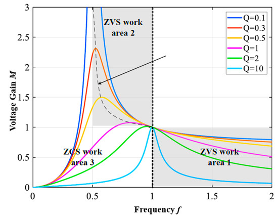 Voltage gain M vs. frequency f by varying the Q-factor [21].