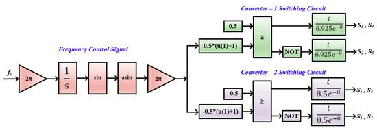 The development of the switching frequency design was concluded based on the information provided in Figure 5. This design enables the generation of pulses that may be used to switch the switches ON and OFF [34,35]. The 180-degree phase shift technique is employed to control the input voltage within the wide range of 300 Vin–500 Vin, while the VFPSM methodology ensures precise regulation at both the line and load sides [36]. The operation of converters 1 and 2 involves a switching process that utilizes the phase shifting approach known as “before 180°” and “after 180°”, respectively, as seen in Figure 6 [37,38].