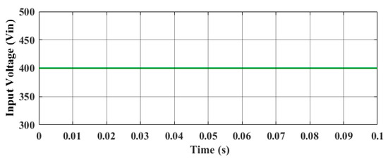 MATLAB/Simulink was utilized to conduct the simulation analysis of the iL2C converter employing the VFPSM control technique. The essential design variables are enumerated in [24]. The evaluation of the converter is provided for various case studies. In the first instance, the nominal input and output voltage under full load, half load, and light load conditions were examined. The nominal input voltage of 400 Vin is depicted as a constant in Figure 7.