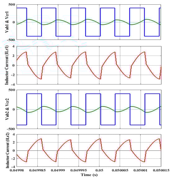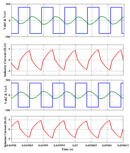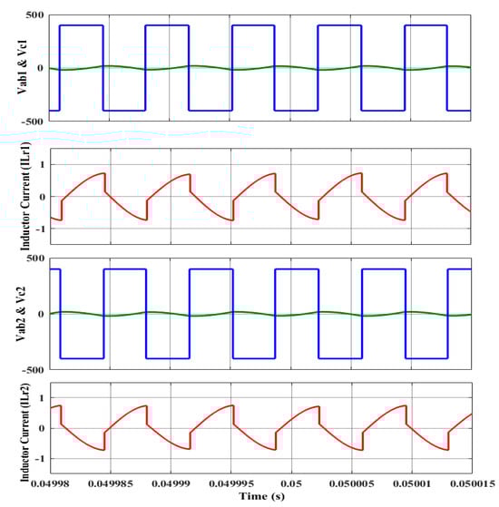 The outcomes of the simulated converter were assessed under controlled nominal load conditions of 68.75 A and 48 V0 at maximum load (3.3 kW). Figure 8 shows the resonant tank waveforms of converter 1 and converter 2, and the converter load voltage and current waveforms are presented in Figure 9. The voltage and current ripple measurements indicated a deviation of +0.5 V (+1.04%) at a rated output of 48 V0 and approximately +0.65 A (+0.94%) at a full load current of 68.75 A, respectively.