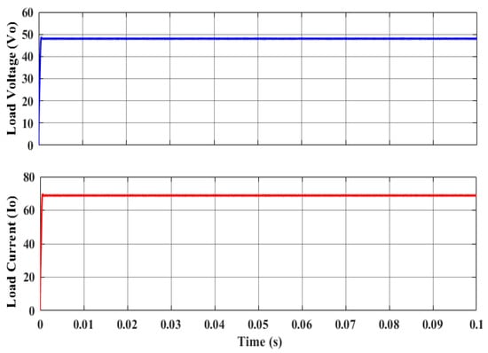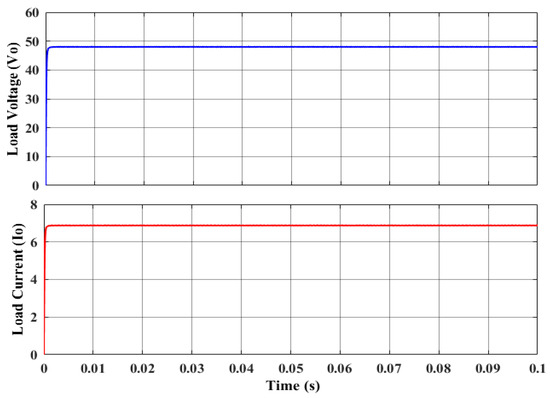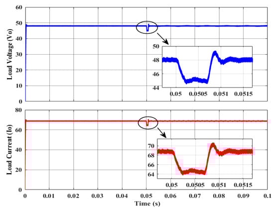 Figure 21 illustrates the load voltage of 48 V and current waveforms at 0.33 kW. The sudden variation in load voltage and current took place at 0.05 s; the enlarged figures are also provided, and the settling time was within 1.4 ms.