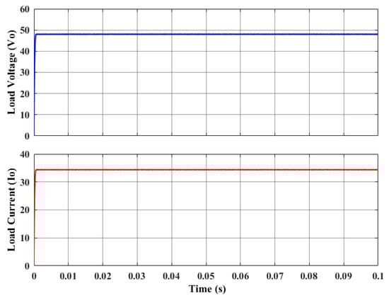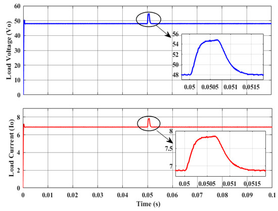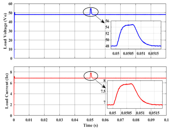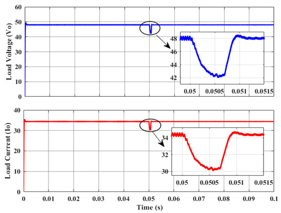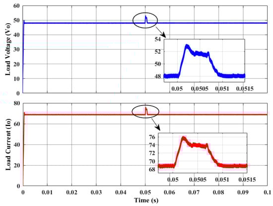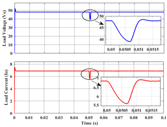 Figure 16 illustrates the load voltage of 48 V and current waveforms at 1.65 kW. The sudden variation in load voltage and current took place at 0.05 s; the enlarged figures are also provided, and the settling time was within 1.0 ms.