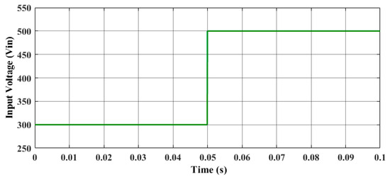 Sudden change in input voltage from 300 Vin to 500 Vin at 0.05 s.