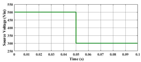 Sudden change in input voltage from 500 Vin to 300 Vin at 0.05 s.