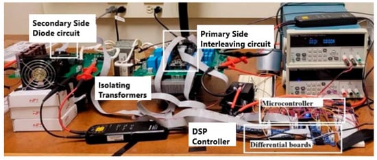The production specifications of the GaN switch GS66508T are listed in [24], where the critical parameters are a drain source voltage of 650 V, a drain current of 30 A, and a low drain resistance of 50 mΩ, respectively. The E-mode GaN transistor possesses advanced characteristics such as an upper cooled technology, resulting in reduced junction–case thermal resistance at high power density [41,42]. It also exhibits decreased drain resistance, reverse recovery current, and zero reverse recovery losses. Additionally, it showcases well-designed gate charge characteristics [43]. The TMS320F28335 serves as the primary controller for the iL2C converter, functioning as a digital signal processor [44,45]. The prototype was constructed according to specific modeling parameters, including a magnetizing inductance of 23 µH for Lm1 and Lm2, resonant inductors of 21 µH for Lr1 and Lr2, resonant capacitors of 56 nF for Cr1 and Cr2, and a filter capacitor of 100 µF for C0. The experimental setup is illustrated in Figure 22.