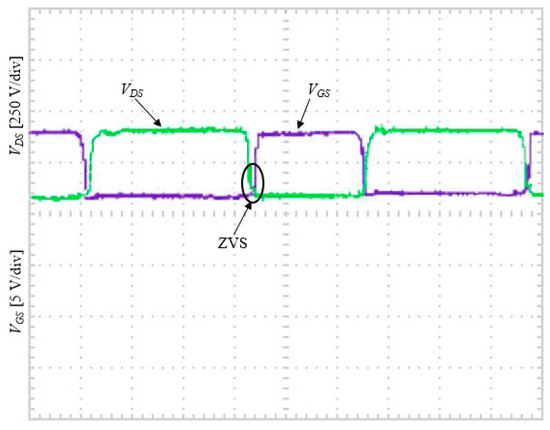 Figure 23 displays the empirical waveforms of the drain and gate voltages of a switch operating with zero voltage switching (ZVS). This clearly demonstrates the successful attainment of ZVS functioning using soft switching.