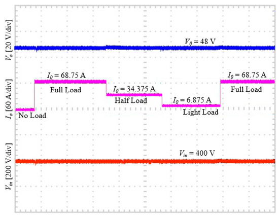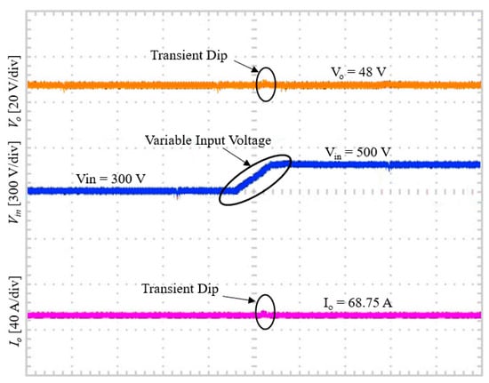 As seen in Figure 25, the iL2C converter was validated for 3.3 kW at 48 V0 and 68.75 A during variable input voltage conditions. The findings were examined with a time scale of 100 ms for each division and a load voltage scale of 20 volts per division, shown by an orange line. The load current scale was set at 50 amperes per division, represented by a pink line. The input source voltage scale was set at 300 volts per division, represented by a blue line. The dynamic responses at the line side were executed by introducing an abrupt alteration in input voltage at 0.05 s (500 ms), resulting in a little modification in load voltage. The corresponding current was then monitored and recorded, as depicted in Figure 25. The converter and controller demonstrated conformity with the theoretical and simulated studies.