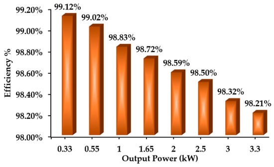 The efficiency of the GaN-powered iL2C converter was evaluated at the recommended voltage settings of 400 Vin and 48 V0. The efficiency was measured at various load conditions, specifically 3.3 kW, 3.0 kW, 2.5 kW, 2.0 kW, 1.65 kW, 1.0 kW, 0.5 kW, and 0.33 kW, sequentially. The efficiency was 98.2% at a power output of 3.3 kW, 98.7% at a power output of 1.65 kW, and 99.1% at a power output of 0.33 kW. Figure 26 displays the efficiency curve in relation to power.
