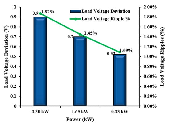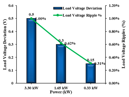 Table 1 shows the transient analysis during simulation conditions of the load voltage deviations, %avg load ripples, transient dip, and %avg dip of the voltage during line regulation (i.e., 300 Vin–500 Vin and 500 Vin–300 Vin) tabulated by maintaining the load voltage at 48 V0 and the load current at 68.75 A, 38.375 A, and 6.875 A, respectively. When the load was 3.3 kW, for (300 Vin–500 Vin) and (500 Vin–300 Vin), the max LVD was found to be +0.40 V and +0.42 V, and the %ALVR was +0.830% and +0.875%, respectively. The transient voltage dip was found to be +5.2 V, −3.5 V, and its average percentage dip was +10.83%, −7.29%, respectively, with a settling time of 1.1 ms and 1.2 ms. In the case of 1.65 kW, the max LVD was found to be +0.38 V and +0.40 V, and the %ALVR was +0.791% and +0.833%, respectively. The transient voltage dip was found to be +4.8 V, −5.8 V, and its average percentage dip was +10.00%, −12.08%, respectively, with a settling time of 1.0 ms and 1.2 ms. Lastly, in the case of 0.33 kW, the max LVD was found to be +0.37 V and +0.38 V, and the %ALVR was +0.770% and +0.791%, respectively. The transient voltage dip was found to be +6.35 V, −8.70 V, and its average percentage dip was +13.23%, −18.12%, respectively, with a settling time of 1.33 ms and 1.4 ms.