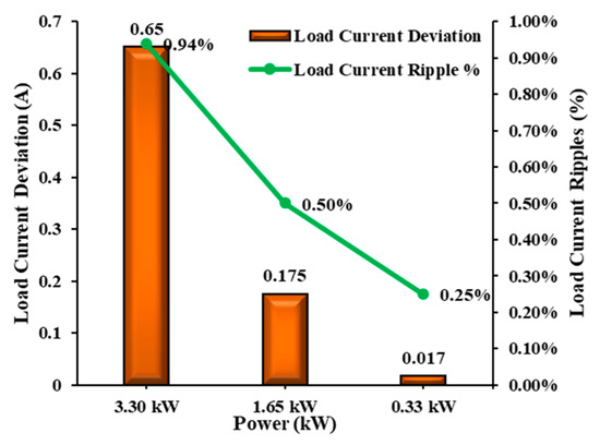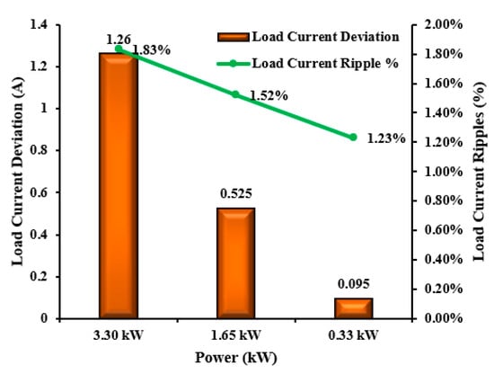 Table 2 shows the transient analysis during simulation conditions of the load current deviations, %avg load ripples, transient dip, and %avg dip of the current during line regulation (i.e., 300 Vin–500 Vin and 500 Vin–300 Vin) tabulated by maintaining the load voltage at 48 V0 and the load current at 68.75 A, 38.375 A, and 6.875 A, respectively. When the load was 3.3 kW, for (300 Vin–500 Vin) and (500 Vin–300 Vin), the max LCD was found to be +0.59 A and +0.64 A, and the %ALCR was +0.85% and +0.93%, respectively. The transient current dip was found to be +7.25 A, −4.75 A, and its average percentage dip was +10.54%, −6.90%, respectively, with a settling time of 1.1 ms and 1.2 ms. In the case of 1.65 kW, the max LCD was found to be +0.57 A and +0.62 A, and the %ALCR was +1.66% and +1.81%, respectively. The transient current dip was found to be +3.82 A, −2.25 A, and its average percentage dip was +11.11%, −6.54%, respectively, with a settling time of 1.0 ms and 1.2 ms. Lastly, in the case of 0.33 kW, the max LCD was found to be +0.055 A and +0.069 A, and the %ALCR was +0.8% and +1.0%, respectively. The transient current dip was found to be +1.85 A, −1.87 A, and its average percentage dip was +26.91%, −27.20%, respectively, with a settling time of 1.33 ms and 1.40 ms.