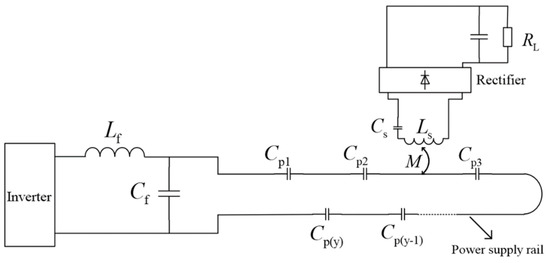 Based on the LCC-S resonant compensation topology, the structure of the electric vehicle DWPT system is shown in Figure 1. represents the series compensating inductance at the transmitter end, while represents the parallel compensating capacitance. indicates the inductance of the receiving coil, and represents the series compensating capacitance at the receiver end. M represents the mutual inductance between the power supply rail and the receiving coil. , , … , denote the series compensating capacitance at the transmitter end. In the centralized power−supply rail mode, the series compensating capacitance at the transmitter end adopts a distributed compensation structure, effectively preventing a steep increase in voltage at both ends of the power supply rail due to long-distance laying.