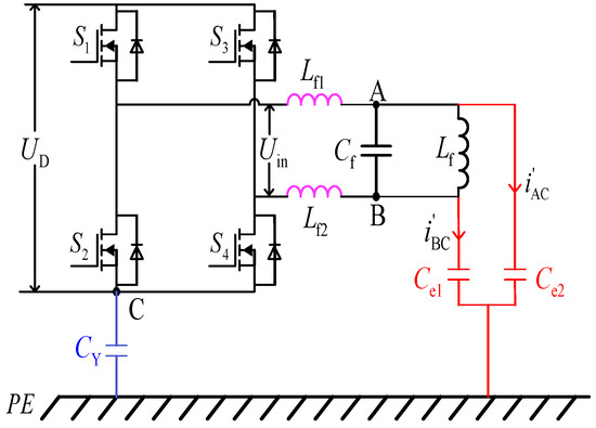 In the practical application of the DWPT system, when the length of the power rail at the transmitting end remains constant and the vertical distance between the rail and the ground remains constant, the capacitance between the power rail and the ground can be considered constant. According to the formula “i = Cdu/dt”, the voltage of the power rail with respect to the ground is another key factor affecting the magnitude of leakage current. As shown in Figure 4, by neglecting the parasitic capacitance between the transmitter’s switch power supply and the heat sink, the ground capacitance between the power supply rail and the earth, denoted by and , emerges as the primary factor contributing to the generation of capacitive currents at the transmitter end. Here, represents the DC bus voltage, and A and B represent the two endpoints of the power supply rail, while point C denotes the negative terminal of the inverter’s DC bus. Although a certain amount of noise current is generated by the negative pole of the inverter circuit with respect to ground, it can be reasonably assumed that point C is at the same potential as PE concerning high-frequency voltage coupling, given that point C is adequately grounded through the Y capacitor [21]. Consequently, the voltage to earth of the power supply rail can be regarded as the voltage between points A and B relative to point C.