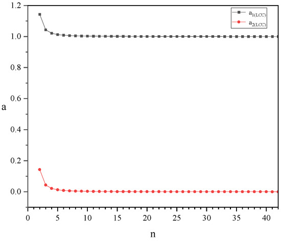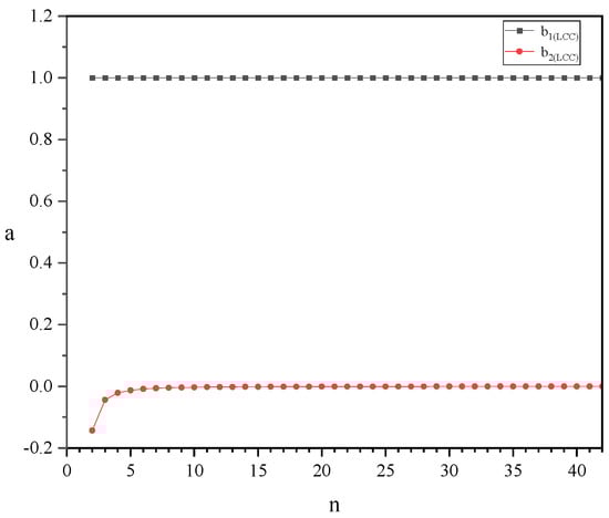 First, according to Equations (14) and (15), according to Equation (4), with the bilateral structure, the structure is symmetrical, but according to the circuit analysis, the voltage to ground and are different, so the currents and are different. Afterward, according to Equations (9), (14) and (15), the Fourier series expansion of the voltage to ground at the two ends of A and B consists of two main parts: the dc component term and the high-order harmonic Fourier series term. However, the coefficients in front of the Fourier series term determine the magnitude of each order harmonic, and in order to visualize and analyze the difference between the higher harmonics in the voltage to ground at points A and B at the two ends of the coil of the type unilateral/symmetric resonance topology, such that in Equation (9), let the coefficient before the Fourier series term in Equation (4) be 1. Let , in Equation (14), and in Equation (15). , , , and represent the constant term coefficients of the higher harmonics of the voltage to ground, respectively. Figure 6 and Figure 7 below show the trends of , , , and with n, respectively.