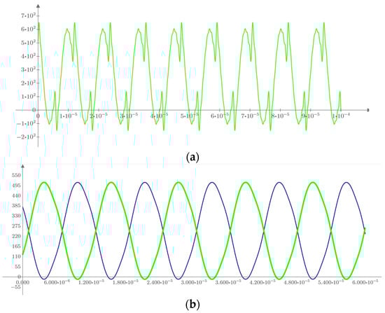 Based on the computation results provided in Table 3 and Table 4, the complex expressions of the fundamental voltage and higher-order harmonic voltages are subsequently transformed into trigonometric form. Using the obtained results, voltage waveform diagrams are plotted for points , , and under both structures, as depicted in Figure 9.