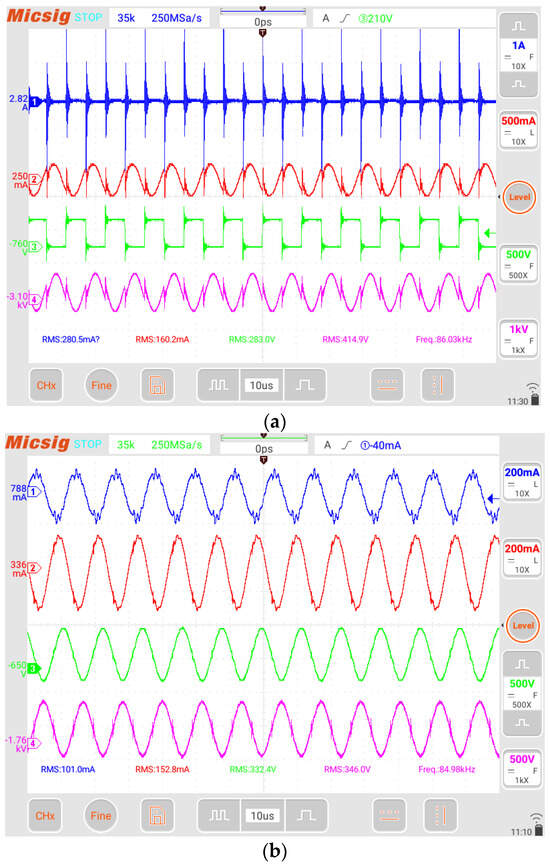 Experimental measurement waveforms of leakage current and voltage to earth. (a) Unilateral resonant topology: (Purple), (red), (green), and iBC (blue). (b) Bilateral resonant topology: (Purple), (Red), (Green), and (Blue).