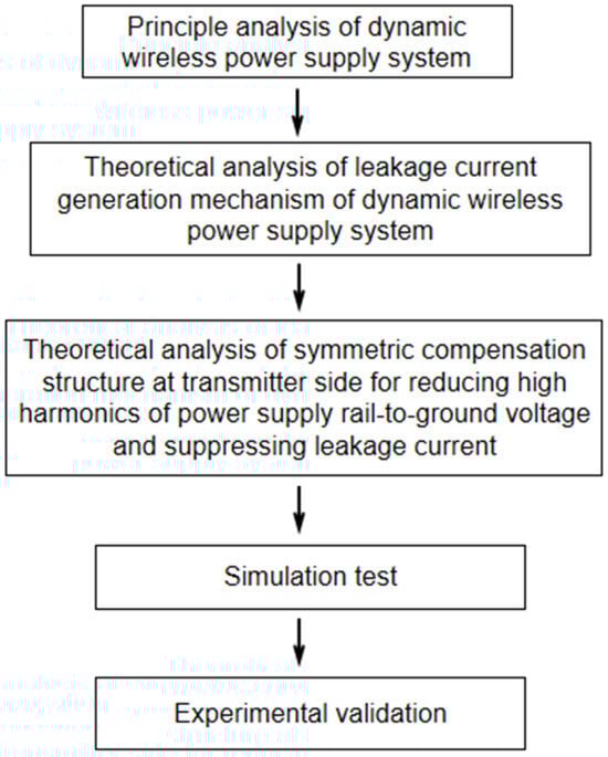 However, when the bilateral resonant compensation topology is adopted at the transmitter, both the waveforms of and tend to resemble triangular function waveforms. This indicates a significant reduction in the higher harmonic content in and and an effective improvement in waveform distortion. Moreover, the similar root–mean–square values of and preliminarily demonstrate that the ground impedance at both ends of the transmitting rail is the same when the bilateral resonant compensation topology is employed. Compared to , the root–mean–square value of significantly decreases, and the waveform distortion improves noticeably. Therefore, the root–mean–square value of decreases, and the waveform distortion improves noticeably. Compared to , the root–mean–square value of slightly increases, but the overall waveform of is smoother with minimal voltage transients. As a result, the root–mean–square value of significantly decreases, and the waveform distortion improves noticeably. Based on the RMS values of supply rail voltage to ground and leakage current measured in Table 6a,b for two different compensation structures, it can be found that the RMS values of and are smaller than those of and , respectively, and that the RMS value of the leakage current is substantially lower than that of for the same bus voltage of the high-frequency inverter in addition to the positive correlation between the voltage to ground and the leakage current. The effectiveness of suppressing the magnitude of leakage current by suppressing the high harmonics of the voltage to ground has been demonstrated, and the flowchart of the research methodology is provided in Figure 14.