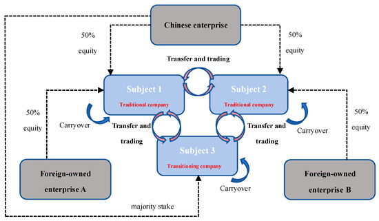 Considering the reality of China’s automotive industry, as depicted in Figure 1, this study focuses on a horizontal alliance consisting of three equity-related enterprises. All three companies are domestic passenger vehicle companies engaged in both internal combustion engine vehicles and new energy vehicles, with equity types classified as joint venture, joint venture, and Chinese enterprise. This assumption aligns with “China Passenger Vehicle Enterprise Average Fuel Consumption and New Energy Vehicle Credits Calculation Sheet”, as well as the equity relationships among major Chinese passenger vehicle producers.