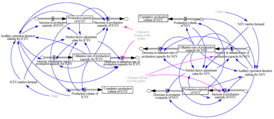 The production sub-model reflects the automotive production processes and decision-making within a vehicle company. Fundamentally, vehicle companies engage in profit-seeking behavior through external market activities and refine their strategies internally. considering the external characteristics of the dual credit policy, there exists a more intimate relationship of response between enterprises and the market as two main stakeholders. This is largely due to the distinct preferences of consumers towards traditional ICEVs and NEVs in terms of attributes and purchase decisions [36]. Consequently, under the impetus of respective market demands, automobile manufacturers primarily adjust the production volume of both vehicle types by manipulating production capacity and capacity utilization rates [11]. As shown in Figure 3, the company produces traditional fuel vehicles and new energy vehicles according to market demands and adjusts production based on purchasing credits from the external credit market. This study assumes that over time, market demand changes, and companies respond to these changes, indicating their operational strategies in both internal combustion engine vehicles and new energy vehicle sectors.