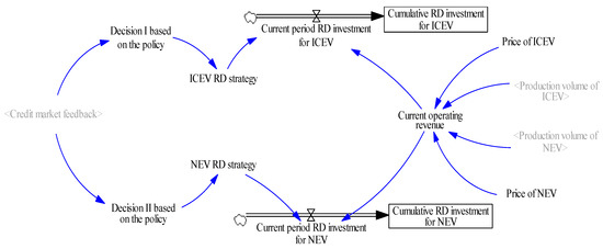 Under the influence of the dual-credit policy, companies give priority to producing more new energy vehicles and, based on credit status, may opt for a moderate overproduction of new energy vehicles before considering reducing internal combustion engine vehicle production. The extent of new energy vehicle production increase and internal combustion engine vehicle production decrease is determined by the strictness of the dual-credit policy execution and the company’s credit situation. The auxiliary variable “Policy-based Decision” will be further elaborated in the R&D sub-model.