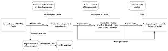 In the credit interaction sub-model, the vehicle company’s current CAFC positive credits can carryover or transfer, while CAFC negative credits can be offset by carryover credits, transferred credits, or NEV positive credits. Current NEV credits can carryover, or trade within related companies, and NEV negative credits can be offset by carryover credits or traded credits. As shown in Figure 5, this study stipulates that the order of credit settlement for companies is carryover, transfer between related companies, and then trading in the external credit market. Vehicle companies first use carryover credits to offset negative credits. If there are still CAFC (NEV) negative credits after settling carryovers, the priority for transferring (trading) related companies’ CAFC (NEV) positive credits is from Chinese-owned to joint venture companies. If there are still negative credits after settling with related companies, credits are purchased from the credit market. This assumption conforms to the parallel management rules of the dual-credit policy and reflects the actual conditions of passenger vehicle companies.