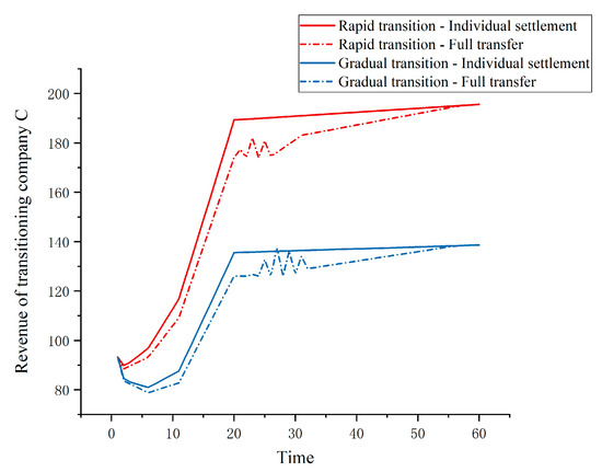 Scenario 3 compares the annual revenue results of transitioning company C under different transition speeds. The annual revenue of the transitioning company is illustrated in Figure 8. When the transitioning company C undergoes rapid transition and the credits are settled independently among the three companies, company C has the highest revenue. On the other hand, when the transitioning company C transitions slowly and transfers all current-period credits, its revenue is at its lowest. Regardless of the transition speed, the revenue of transitioning company C still inversely correlates with the transfer coefficient. Furthermore, when transitioning quickly, not transferring any credits leads to a 3.71% higher average annual revenue for company C compared with fully transferring credits, and this percentage increases to 3.45% when transitioning slowly. Therefore, the higher the proportion of surplus credits transferred by transitioning company C, the lower its revenue, and the faster the transition speed, the greater the cumulative revenue disparity. Additionally, the speed of the transition of company C does not affect the timing at which the average annual revenue plateaus across scenarios.