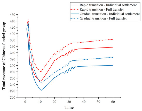 For the Chinese capital group, the total operating revenue resulting from the transition of company C is depicted in Figure 9. Similar to Scenarios 1 and 2, under the rapid or slow transition of company C, the higher the credit transfer ratio, the higher the group’s total operating income. This is because the transition of company C does not reverse the degree of free riding by traditional companies A and B, who continue to adjust production according to the credit transfer ratio. Moreover, the compression of fuel car production by traditional companies A and B affects the group’s total revenue in the early stages, with the allowance of credit transfer enhancing early-stage performance. An increase in the transition speed of company C brings about more revenue in later stages; thus, when company C transforms rapidly and transfers all surplus credits, the group achieves the highest total revenue. Independently settling credits does not affect traditional companies’ purchases of credits due to the transition speed of the transitioning company. However, when all credits are transferred by the transitioning company, the faster the transition speed, and the fewer credits the group needs to buy from the market.