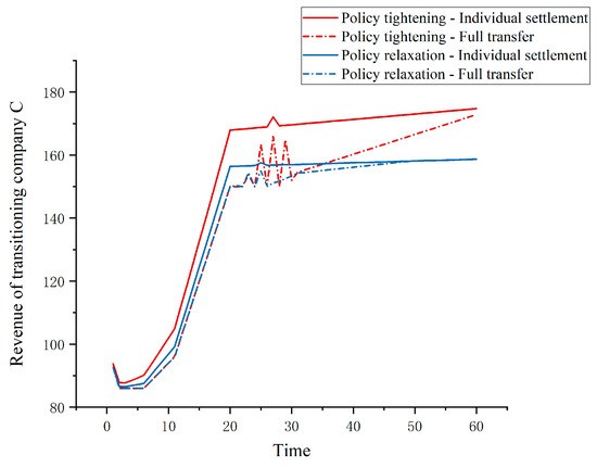 Scenario 4 compares the annual revenue of transitioning company C under varying degrees of policy tightness, as shown in Figure 10. When policies become stringent, the NEV credit ratio requirement increases, and the three companies settle credits independently, and the revenue of transitioning company C is at its highest. When policy requirements tighten, companies receive fewer credits, and the supply of credits in the external market also shrinks, causing credit prices to rise. This increased credit price benefits transitioning company C, which does not need to assist affiliated companies, resulting in a 6.22% higher average annual revenue when settling credits independently compared with fully transferring, while under loose policy conditions, the difference is only 1.63%. As seen in Figure 10, under different levels of policy tightness, the revenue of transitioning company C continues to form an inverse relationship with the transfer coefficient, with credit prices amplifying differences in corporate revenues. Furthermore, if transitioning company C chooses to transfer all surplus credits to traditional companies A and B, its revenue stays relatively constant in the first 20 periods. Due to policy adjustments, the significant negative credit balance from the large-scale production of fuel cars by traditional companies A and B leaves transitioning company C with no surplus credits to sell and thus no related revenue.