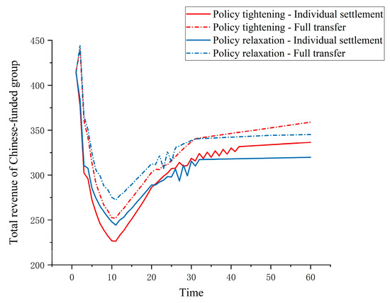 Figure 11 shows the total operating revenue of the Chinese capital group. Based on the parameters of Scenarios 1 and 2, under both relaxed and tightened policy regulations, if a horizontal alliance strategy involves the full transfer of surplus credits, the group realizes higher revenue performance. Under tightened policy conditions, compared with relaxed or standard policy scenarios, joint ventures generate more negative credits, leading to a lower level of total revenue in the early to mid-simulation periods due to a combination of increased credit prices caused by a reduction in market supply and the compressed production of fuel cars following the purchase of credits. Once the three companies complete their transitions and contribute credits to the market, the total revenue of the Chinese capital group rebounds and exceeds that under other policy regulation scenarios.