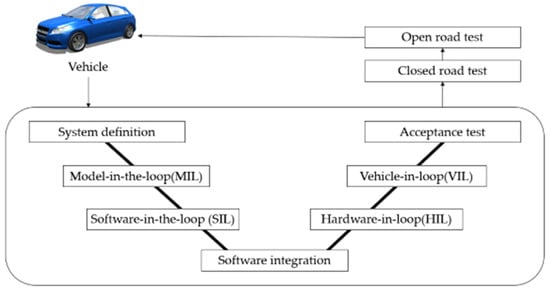 In this paper, the distributed drive vehicle with drive-by-wire four-wheel steering is taken as the research object, and the wheel torque and angle are jointly controlled. The research and development process of the modern vehicle control system is shown in Figure 3. This paper mainly studies the design of model-in-the-loop (MIL) and software-in-the-loop (SIL). Simulation research can greatly reduce the development time and cost in the process of system development, so this paper will conduct simulation analysis to verify its feasibility.