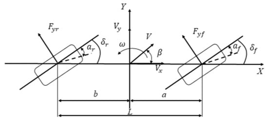 Where and are the yaw rate and side slip angle. and are the tire slip angles. Fyf and Fyr denote the front and rear tire lateral forces. and are the desired front and rear wheel angles. a is the distance from the center of mass of the vehicle to the front axle, and b is the distance from the center of mass of the vehicle to the rear axle. L is the vehicle wheelbase. V is the vehicle centroid velocity; Vx and Vy are the components of the vehicle centroid velocity on the X and Y axes, respectively. According to Newton’s second law, the dynamic equation of the vehicle can be derived as