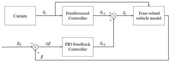When the side slip angle of the center of mass is maintained near zero, it allows for better completion of pre-viewing the driving trajectory and timely adjustment of the vehicle’s attitude. In this section, a “feedforward + feedback” four-wheel steering control system is designed with the zero centroid side slip angle as the control target. The structure of the control system is shown in Figure 5: