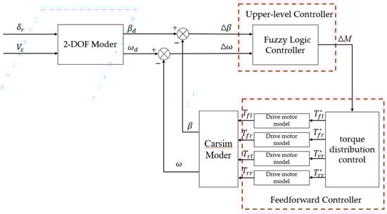 In this section, the DYC system with an ideal yaw rate as the control target is designed. Based on the layered control strategy, the additional yaw moment is calculated in the upper layer, and the torque distribution of each wheel is controlled in the lower layer. The torque distribution control strategy framework is shown in Figure 7.