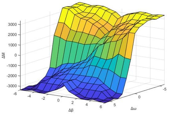 Based on Fuzzy Logic Controller (FLC), a two-dimensional yaw torque fuzzy controller with two inputs and one output is designed. The input values are the yaw rate deviation () and side slip angle deviation (), and the output values are the additional yaw torque (). The fuzzy subset is {PB, PM, PS, ZO, NB, NM, NS}, and the corresponding fuzzy rules are {large, middle, small, zero, negative large, negative medium, negative small}. The control rule fuzzy surface is shown in Figure 8, and the fuzzy control rules are shown in Table 1.
