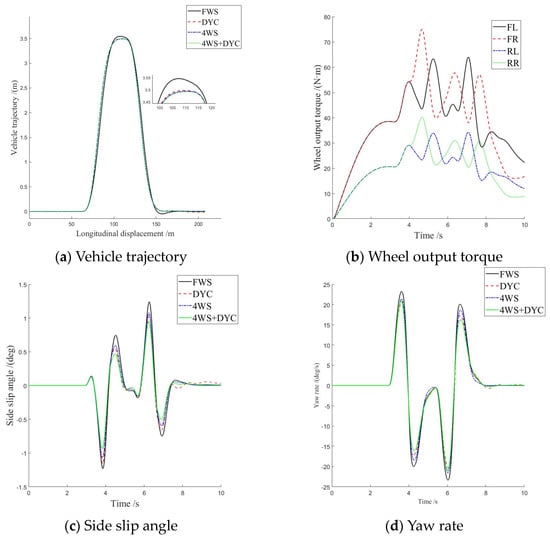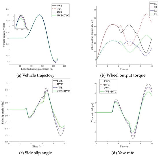 Figure 10c,d reveal consistent trends among all four vehicle models, highlighting significant effects from three control strategies. The peaks of 4WS and DYC are relatively close.