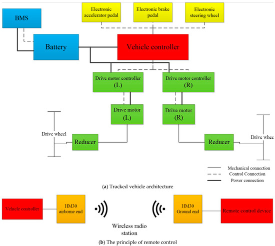 Driving motors are installed on both the left and right sides in the tracked vehicle featuring a dual-sided independent electric-driven structure [21,22,23]. Through the rotation of the motors, power is transmitted to the driving wheels via reduction mechanisms, thereby propelling the rotation of the driving wheels and subsequently driving the movement of the tracks. The principal architecture of the vehicle is composed of batteries, a central vehicle controller, and motor controllers. The battery is tasked with providing the energy required for the vehicle’s operation. The central vehicle controller is required to receive and process input signals from the driver and, based on real-time feedback about the vehicle’s status, issues control commands to the motor controllers in accordance with the control strategy. These commands control the motors on both sides to execute movements such as forward and backward motion and steering of the tracked vehicle. The overall vehicle architecture is shown in Figure 1a.