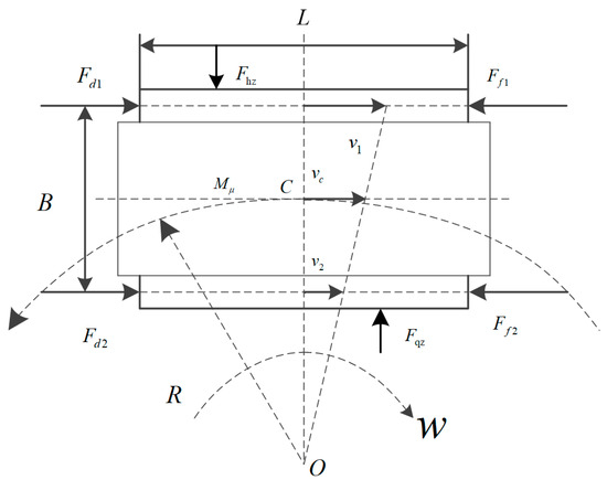 During the kinematic and dynamic analysis of tracked vehicles, minor factors influencing the steering process are disregarded [24,25,26]. Before establishing a simplified model under theoretical conditions, three assumptions are initially proposed: (1) the ground adhesion coefficient and steering coefficient remain constant, corresponding to constant ground friction resistance and steering resistance; (2) the vertical load distribution on the inner and outer sides is uniform, meaning the steering resistance of the two tracks should be consistent, and the steering torque is linearly related to the steering resistance coefficient; (3) the left and right tracks are treated as rigid bodies, experiencing no deformation or stretching during vehicle steering. The schematic diagram is depicted in Figure 2.