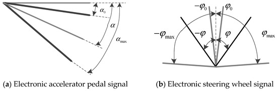 In this paper, the driver input signals from the electronic accelerator pedal, electronic brake pedal, and electronic steering wheel are chosen to be decoded into the corresponding target vehicle speed and target yaw rate for pivot steering of the tracked vehicle. Subsequently, these are further calculated to obtain the target output torques and for the motors on the left and right sides of the tracked vehicle during pivot steering [32]. (Note: Since this paper only analyzes the steady-state steering process during pivot steering, signals from the brake pedal are ignored.)