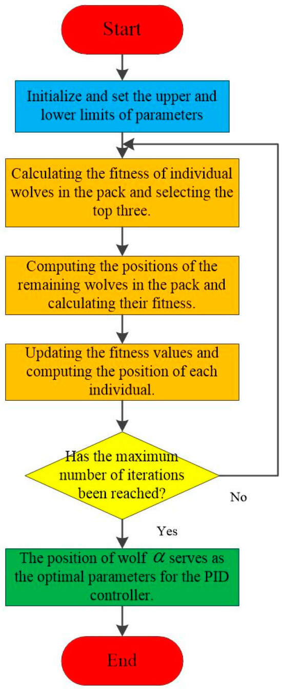 Based on the magnitude of the errors in vehicle speed and yaw rate, the parameters of the PID controller are dynamically adjusted in real time to achieve regulation and control of the pivot steering for tracked vehicles. Therefore, the optimization of the three parameters, namely the proportional parameter , integral parameter , and derivative parameter , is crucial for the control system’s performance. In this paper, the optimal parameters of the PID controller are optimized using the Grey Wolf Optimizer algorithm [35,36,37]. Its schematic diagram is shown in Figure 5 and Figure 6.