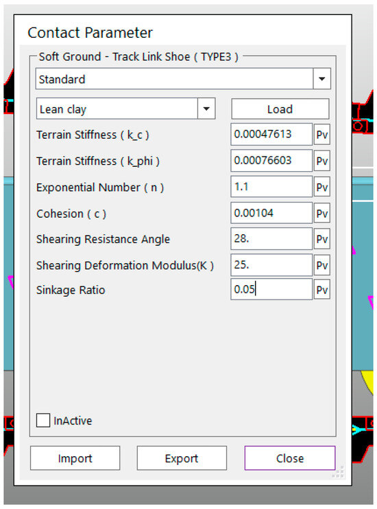 Meanwhile, a road surface model is established in RecurDyn(V9R4), with the parameters selected for a lean clay road surface, as depicted in Figure 8.