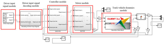 In Figure 9, the co-simulation model includes the driver input signal module, driver input signal decoding module, controller module, motor module, and tracked vehicle dynamics module.