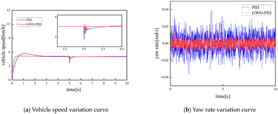 To verify the tracking performance and disturbance rejection capability of the controller designed in the preceding section under a straight-line driving condition, a comparative simulation experiment was conducted between the GWO-PID control and the traditional PID control.