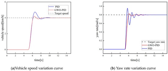 As shown in Figure 11b, under traditional PID control, the tracked vehicle achieves the target yaw rate value during the pivot steering condition with an adjustment time of 2 s. In contrast, under GWO-PID control, the adjustment time to reach the target value is 1.5 s, and GWO-PID control did not significantly increase the overshoot percentage. This clearly demonstrates that the GWO-PID controller has a significant advantage in response speed and offers better control performance.