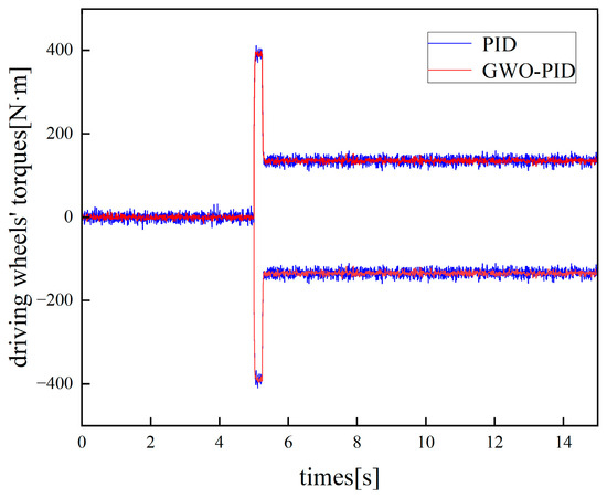 From Figure 12, it can be seen that the vehicle remained stationary from 0 to 5 s. At 5 s, when the vehicle entered the state of the pivot steering, the torque of the inner and outer active wheels was equal in magnitude but opposite in direction, representing driving torque, which aligns with the characteristics of the pivot steering condition. Moreover, compared to traditional PID control, the torque fluctuation range of the active wheels under GWO-PID control was smaller.