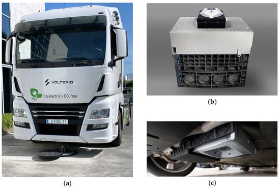- Volterio: The Volterio PRO is an underbody-coupling system developed by the company Volterio to charge electric HDVs. The charging system’s ground unit can supply a charging power of up to 2 , is embedded in the road pavement, resembles a manhole cover and can withstand being driven over by HDTs. Before charging, the ground unit’s cover performs an upwards and then sideways motion to expose a parallel robot, which connects the connector to its counterpart attached to the vehicle’s underbody. The charging system enables AC and DC charging and does not require high parking accuracy [43].
